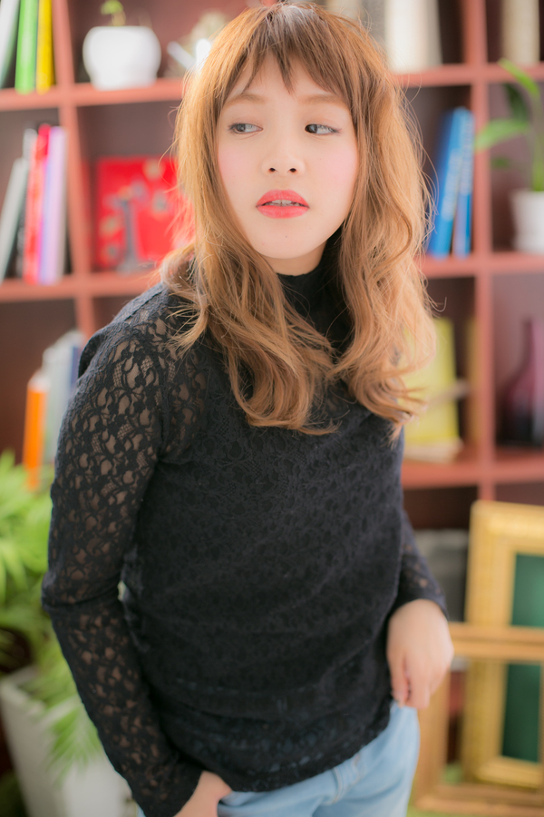 鎖骨ラインの軽やかなふわカールに、個性的な短めバングをプラスすることで、大人カワイイ、コケティッシュスタイルの完成♪余裕を感じさせる無造作感が、海外セレブ風の雰囲気を演出します。斜めバングや厚めバングで、ぐっと印象を変えてもGOOD!