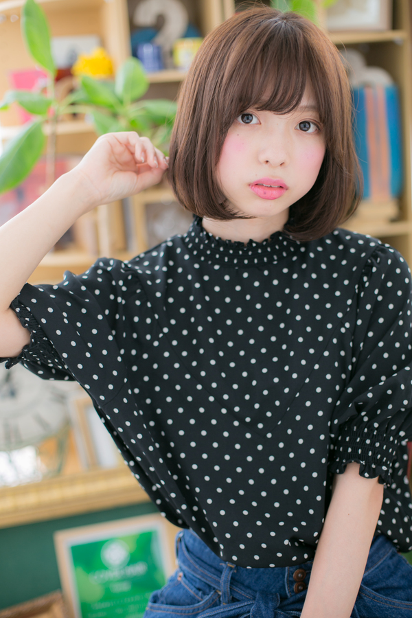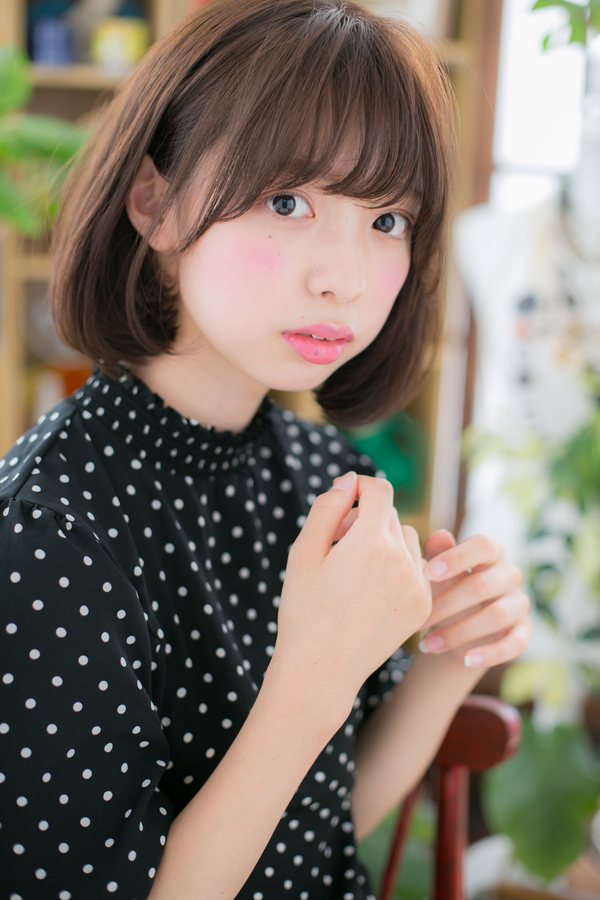 斜めバングで目力UPさせ、前下がりで小顔に見せたフェミニンボブのヘアスタイル。厚めバングや耳かけでガーリーにして大人女子のファッショ度UP。モテ要素たっぷりの黒髪風前下がりボブです。ミディアムヘアを際立たせるグラデーションで髪の毛の悩みも解決!人気のカラーやピンク系のカラーもおすすめ!30代・40代にも◎(メイク担当:COVERHAIRGROUP 中田)