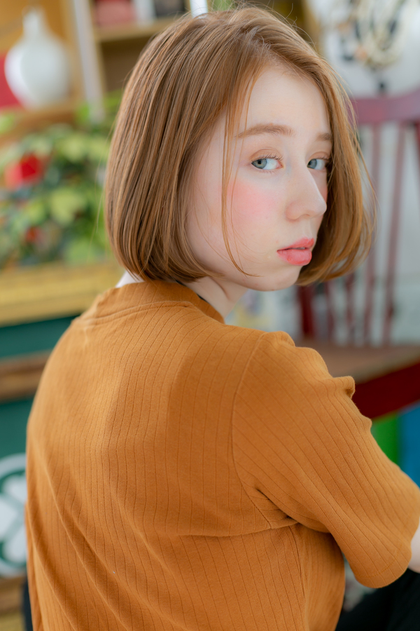 パッと目を引く目立ち度抜群の外国人風カラー。ミディアムヘアを際立たせるグラデーションやベージュの暗めの髪の色もおすすめ!ナチュラルボブが個性的に垢抜けし、大人女子のファッション度UP。30代・40代にもお勧めのヘアスタイルです。(メイク担当:川口店 成田)