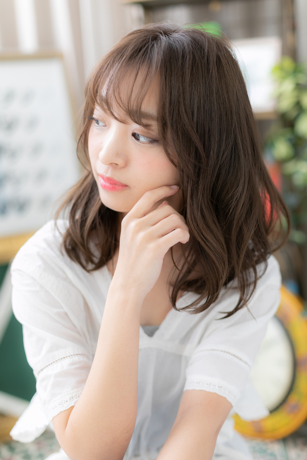 肩のラインのくせ毛風カールが大人かわいいふわミディ。シースルーバングや斜めバングでフェミニンにしたり,厚めバングやオン眉も個性的で大人女子のコーデも完成!ミディアムヘアを際立たせるグラデーションやベージュの暗めの髪の色もおすすめ!(メイク担当:北浦和店 棟方)