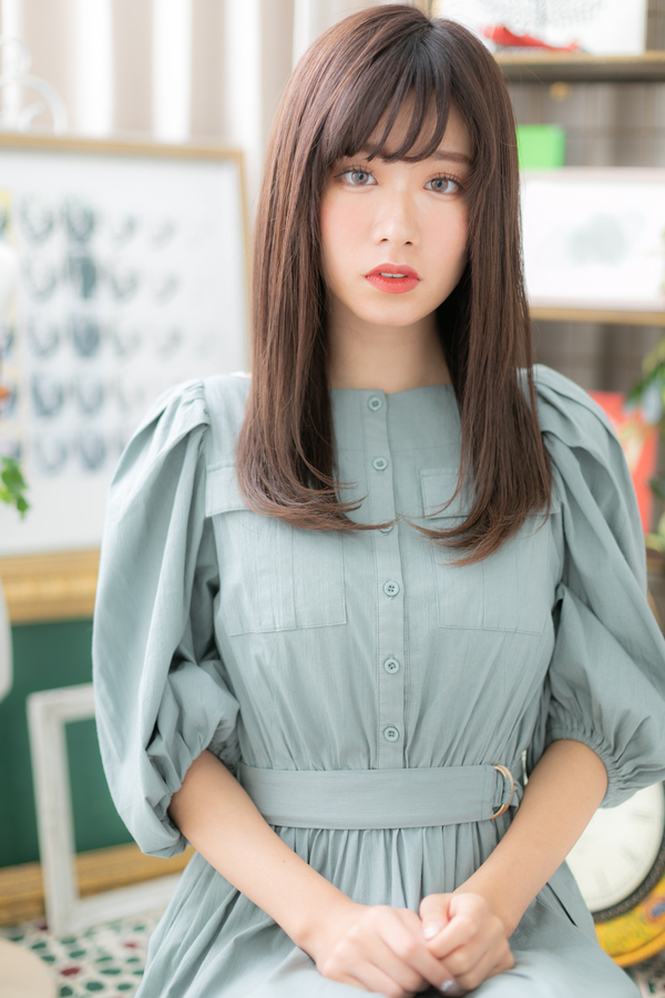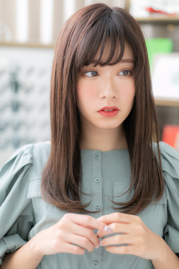 シースルーバングや斜めバングで目元を印象付けたフェミニンロング。ピンク系のカラーでツヤと透明感を出し、レイヤーで軽さを演出。前下がりで小顔に仕上げて美人顔で大人女子のファッション度UPのヘアスタイルです。40代のエラ張り対策にもおすすめ!