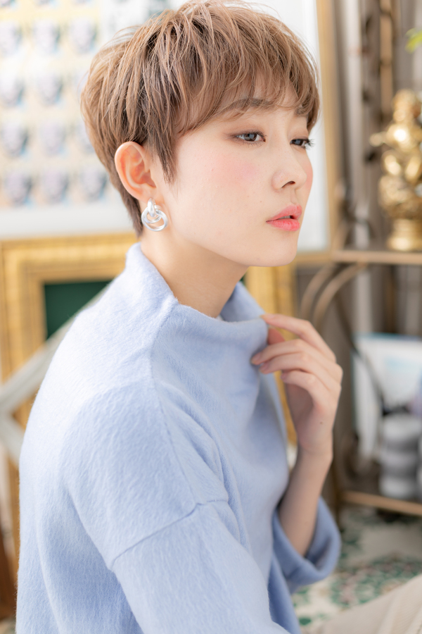 トップからのシースルーバングで目力UPしたハイトーンの外国人風マッシュのヘアスタイル。斜めバングや厚めバング、耳かけやくせ毛風ラフエアリーショートも大人女子のファッション度UP。トリートメントしたようなカラーリングで髪の毛の悩みも解決!人気のカラーやアッシュグレーやグレージュ。ブリーチなしもおすすめ!(メイク担当:北浦和店棟方)