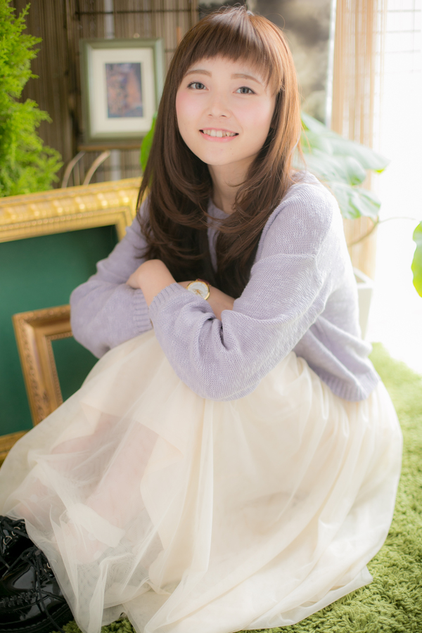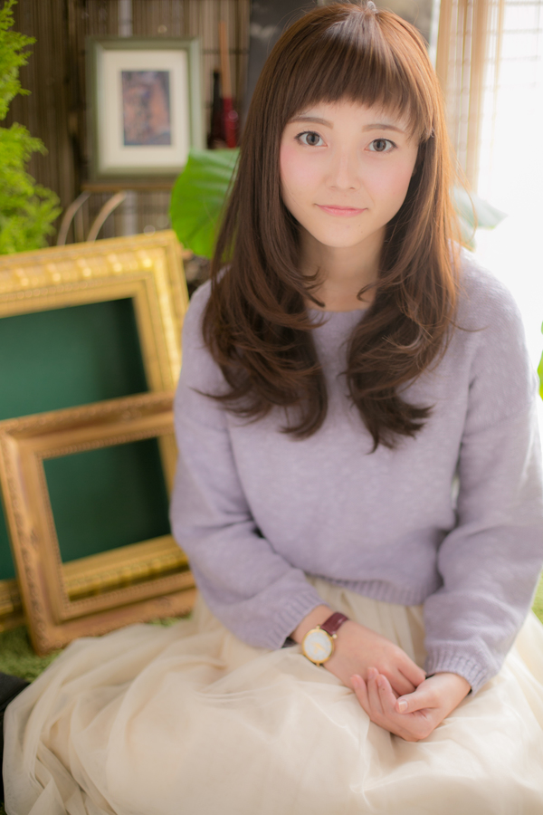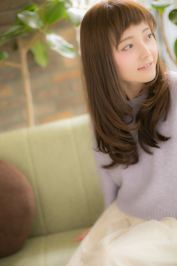 ツヤ感と透明感のあるベージュ系カラーのふわっとワンカールで動きをつけたロングスタイルです。眉上の前髪で可愛さもUP!