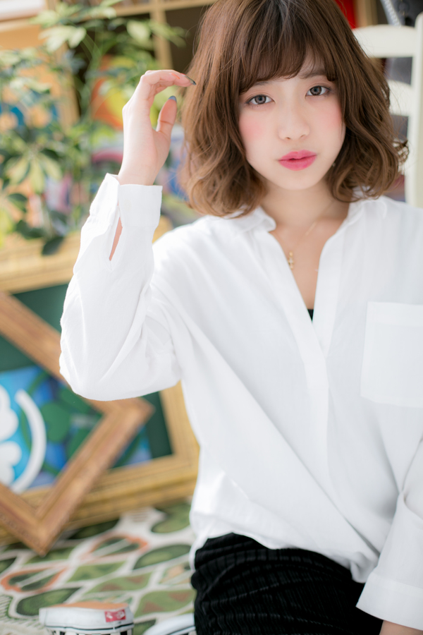 目力UPの斜めバングと前下がりラインで小顔に見せた愛されふわミディなヘアスタイルです。ラフなくせ毛風カールでこなれ感を出して、ナチュラルボブや前下がりボブにヘアアレンジ。厚めバングや耳かけで大人女子のファション度UP!トリートメントしたようなカラーリングで髪の悩みも解消する人気のカラーもおすすめ!(メイク担当:北浦和店 棟方)