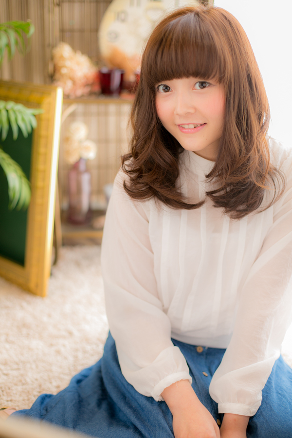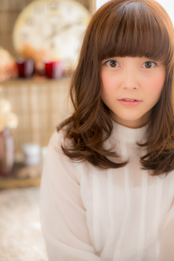 表情,目元を強調する前髪を目の上ギリギリでしっかり作り,柔らかいMIXウェーブで可愛さUP☆伸ばしかけの方にもオススメ。