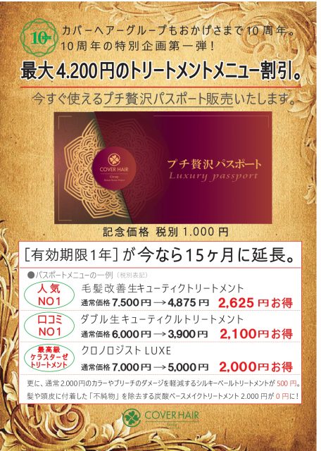 こちらのパスポートをご購入頂いた方は発行日より1年間、COVERHAIRがオススメする極上トリートメントが常にお得に施術できるとってもお得なカードになっております☆