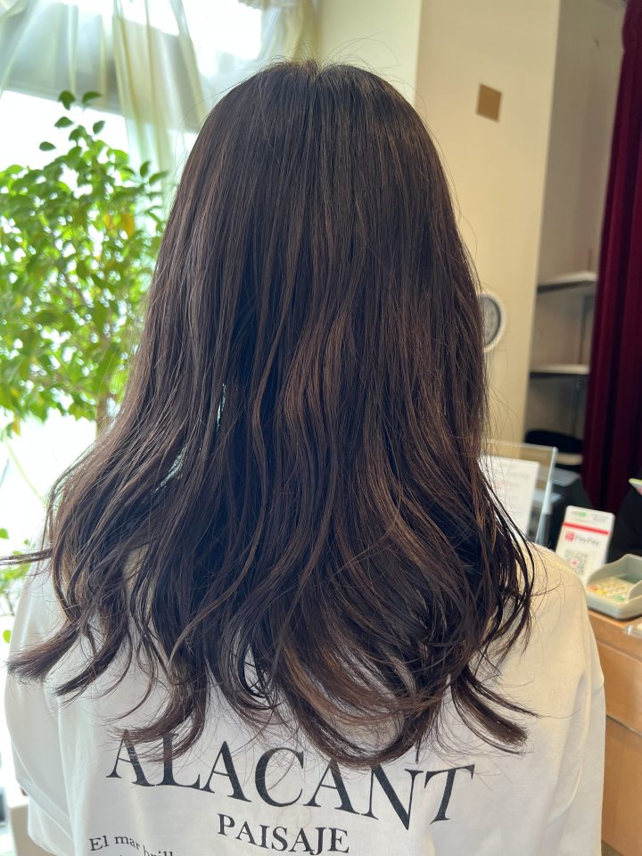 ブラウンっぽく見えるのはブリーチ無しで作っているからで染める前の状態に合わせて配合を調整してます♪