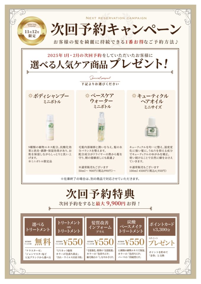 11月、12月限定で1月、2月に次回予約をしていただいたお客様にプレゼントキャンペーンを行っております☆★☆