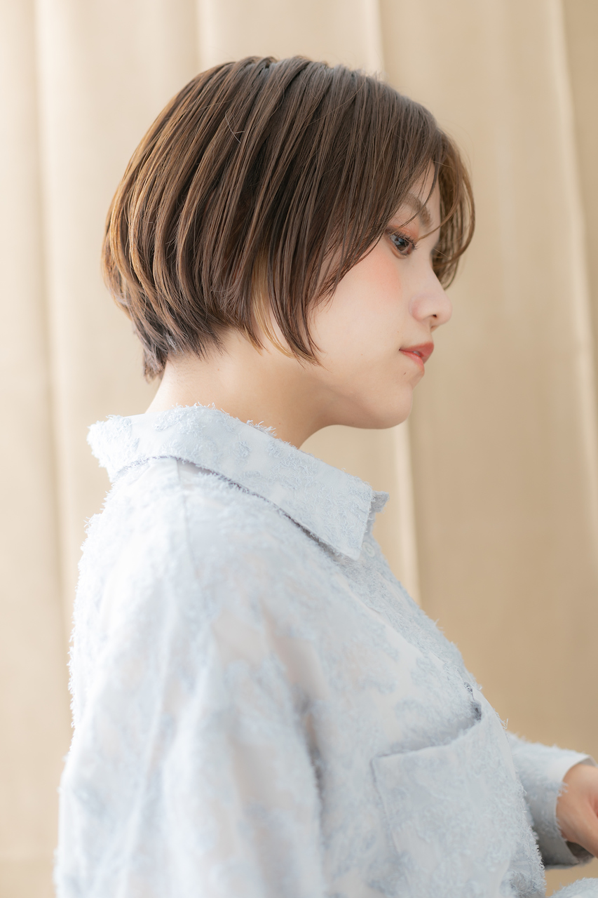 ショート初挑戦の方にオススメの小顔フェミニンショート。外国人風ハイトーンでグラマラス。マッシュボブや大人ボブへの伸ばしかけや、くびれショートや丸みショートからのイメチェンに(メイク担当:北浦和店棟方)