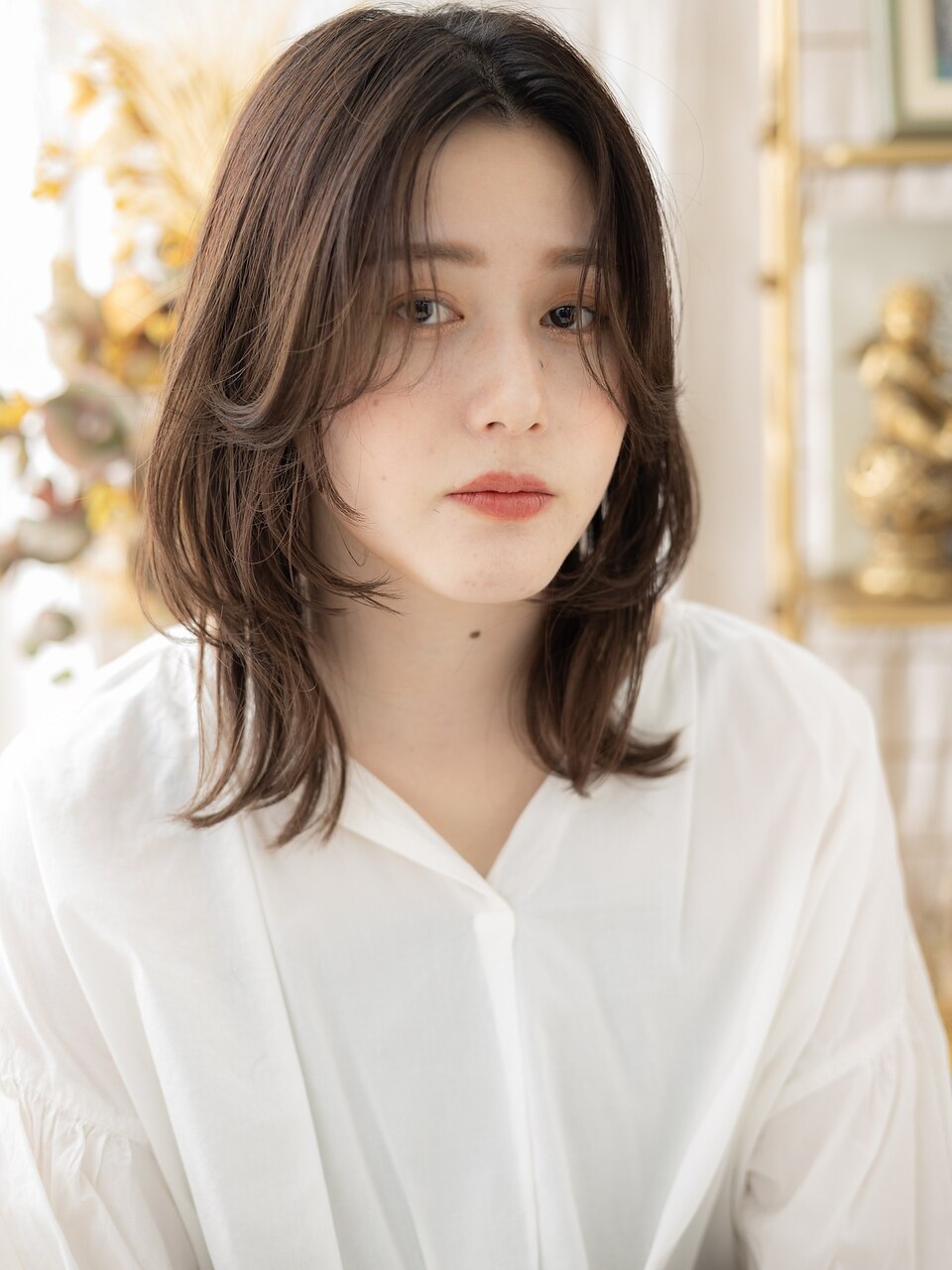 平面的に見えやすいミディはふんわりトップと毛先の空気感でAラインを表現。自宅でも再現しやすい髪型とデイリーシーンに馴染むスタイルが女性に人気♪小顔に見せる前下がりや耳かけも大人可愛い。大人ハイライトも旬。