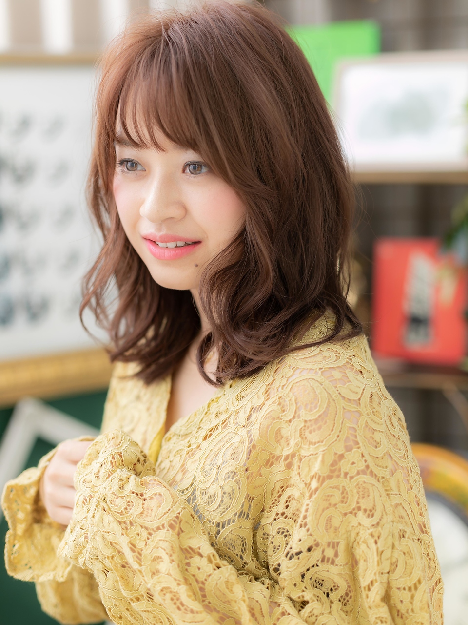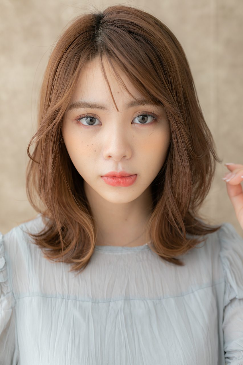 マロンベージュ小顔ミディアムレイヤーカット