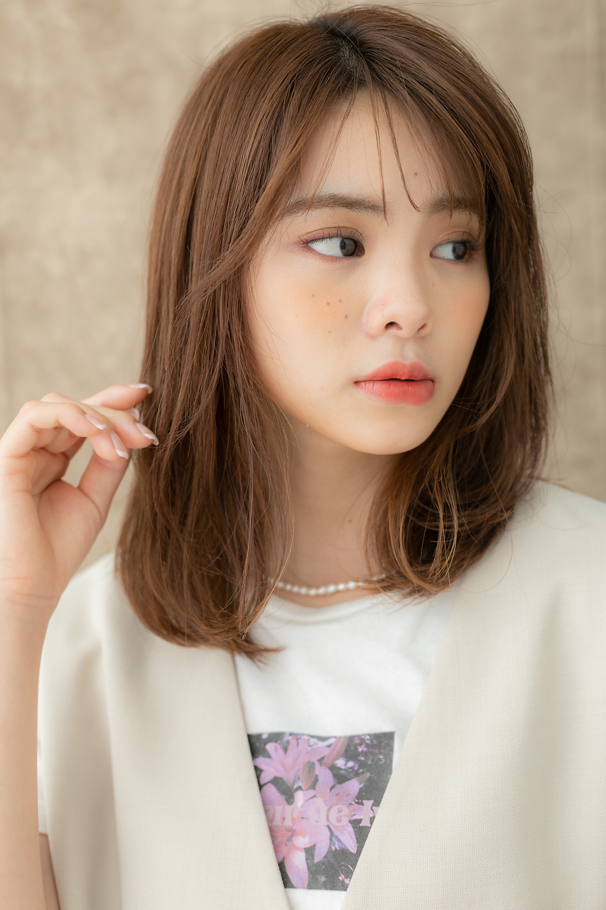 ピンクベージュやピンクブラウンでラブガーリーに仕上げたエアリーミディ。マッシュボブや切りっぱなしボブ、大人ボブやミニボブからの伸ばしかけにGOOD。耳かけや前下がりも大人かわいい。(メイク担当:川口店 岩淵)