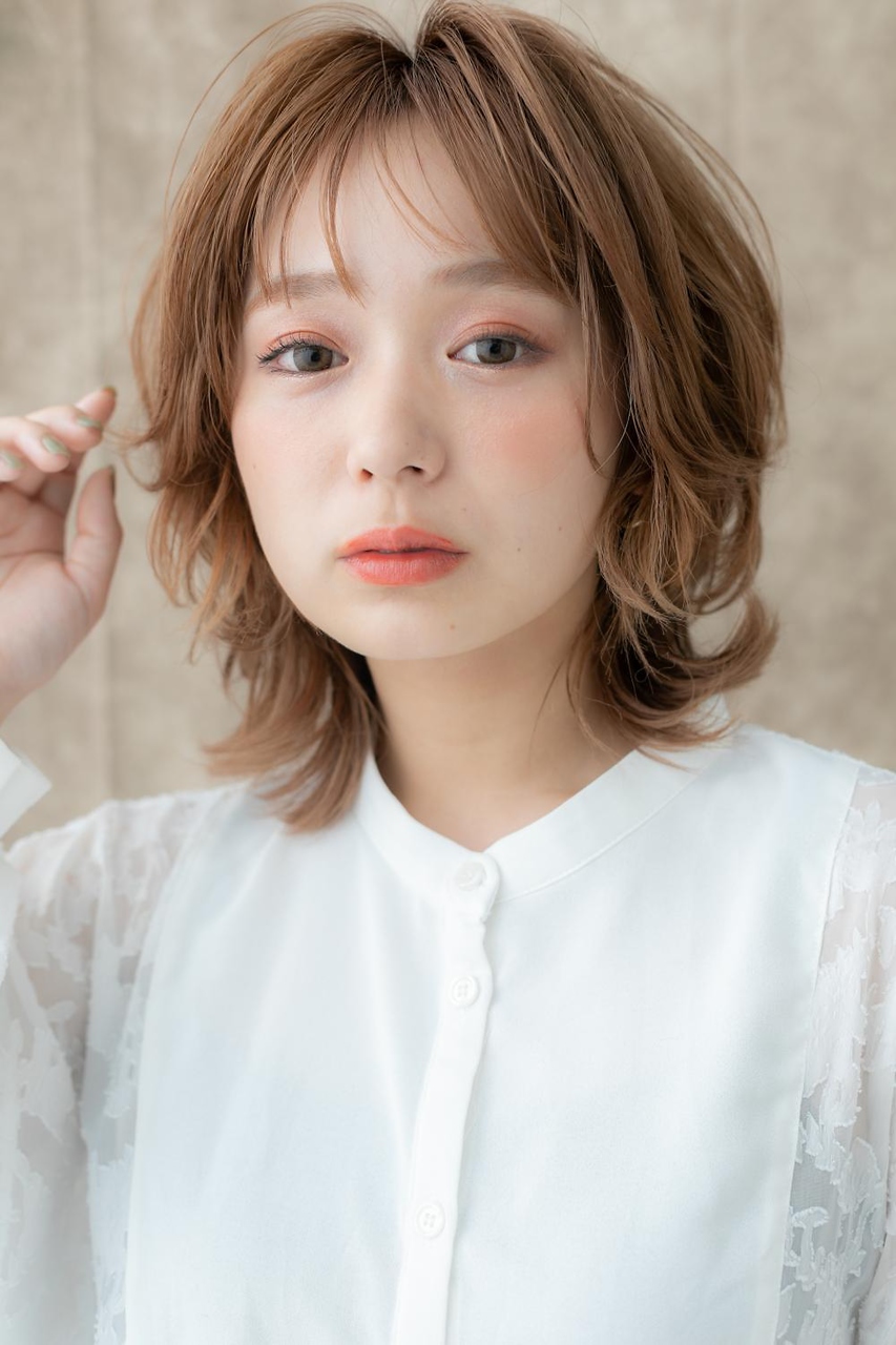 ミルクティーカラーくせ毛風小顔セミディ
