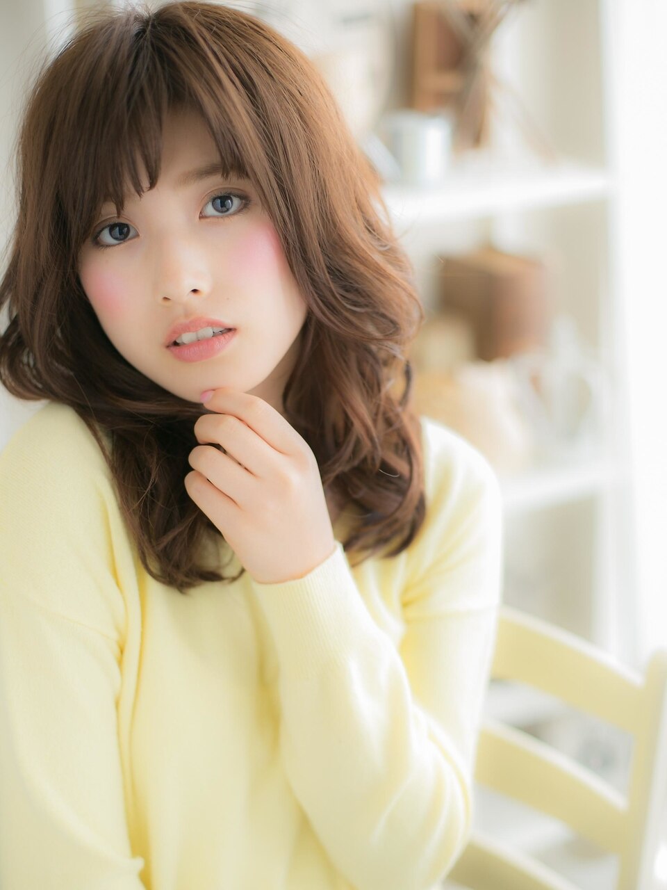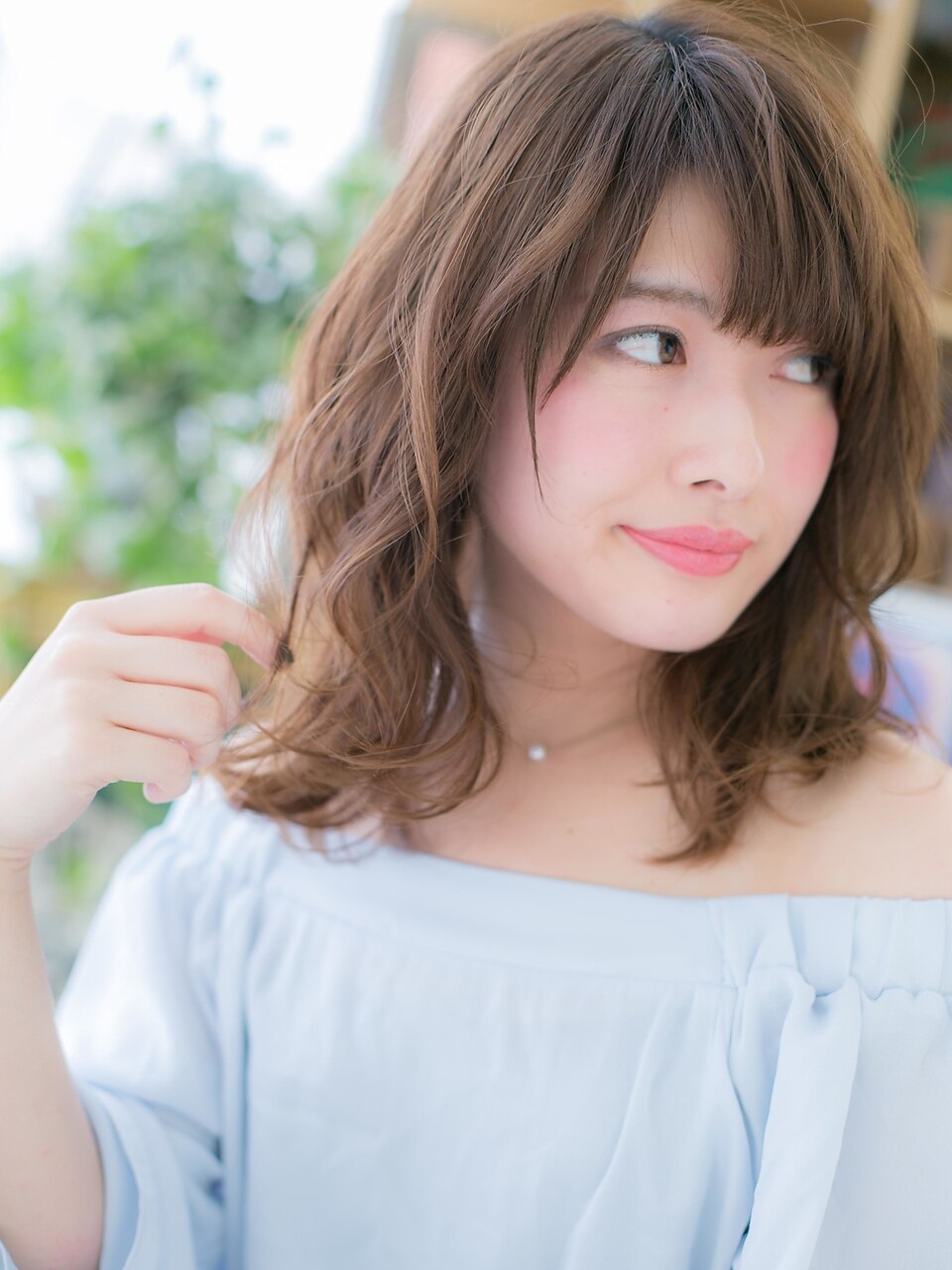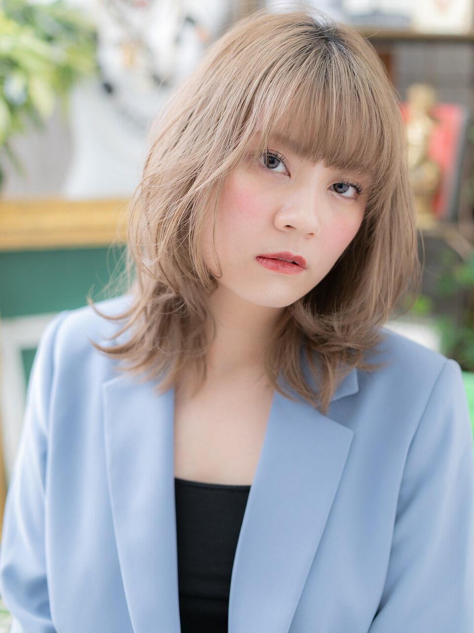 くせ毛風の柔らかなルーズウェーブとハイトーンのベージュ系カラーでHAPPYなカジュアルスタイルに。ふわミディスタイルはヘアアレンジも大人かわいい♪グラマラスな斜めバングや厚めバング、耳かけも小顔でCute♪