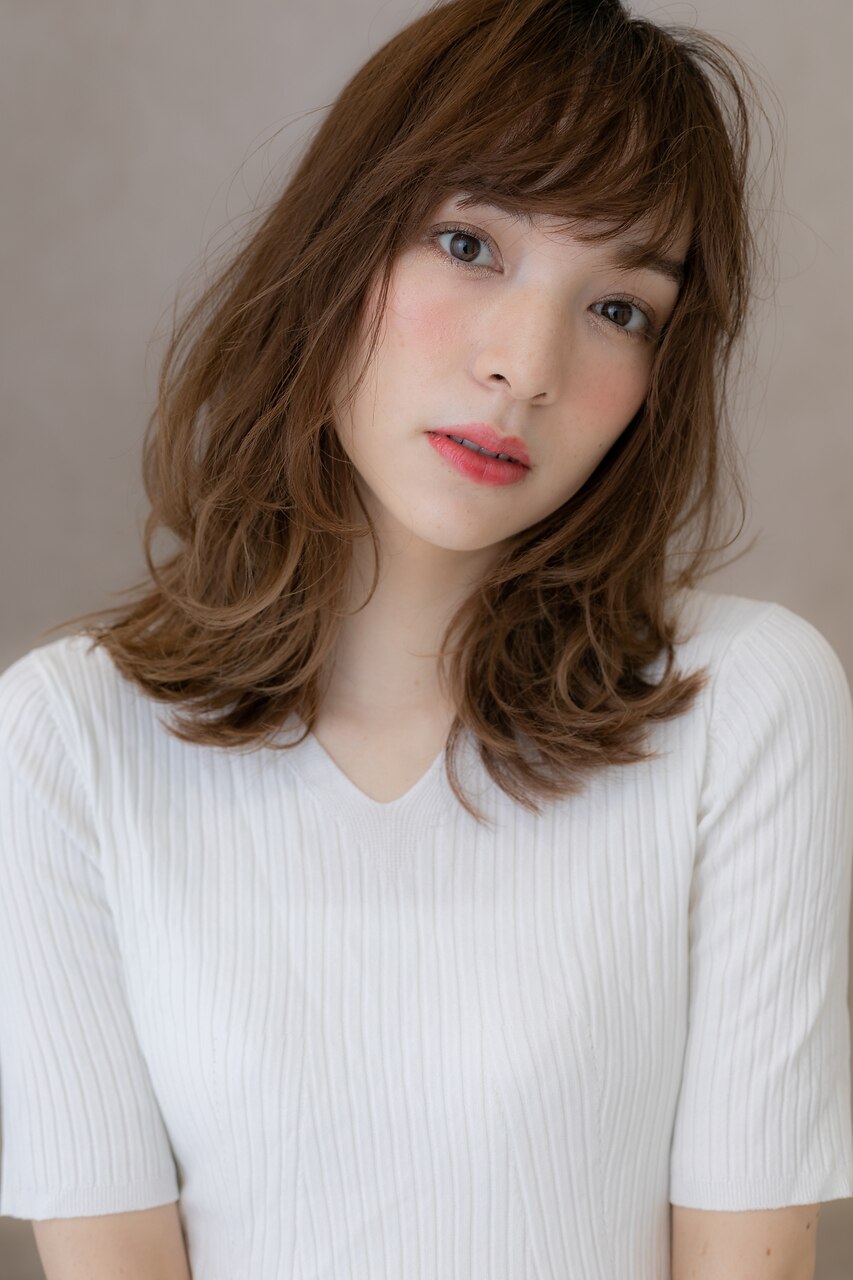 ふわっと広がるひし形シルエットで小顔見せ。オン眉シースルーバングで透け感を。斜めバングや厚めバングで目力UPしてもOK。前下がりで小顔にしたり、耳かけしても大人かわいい髪型。