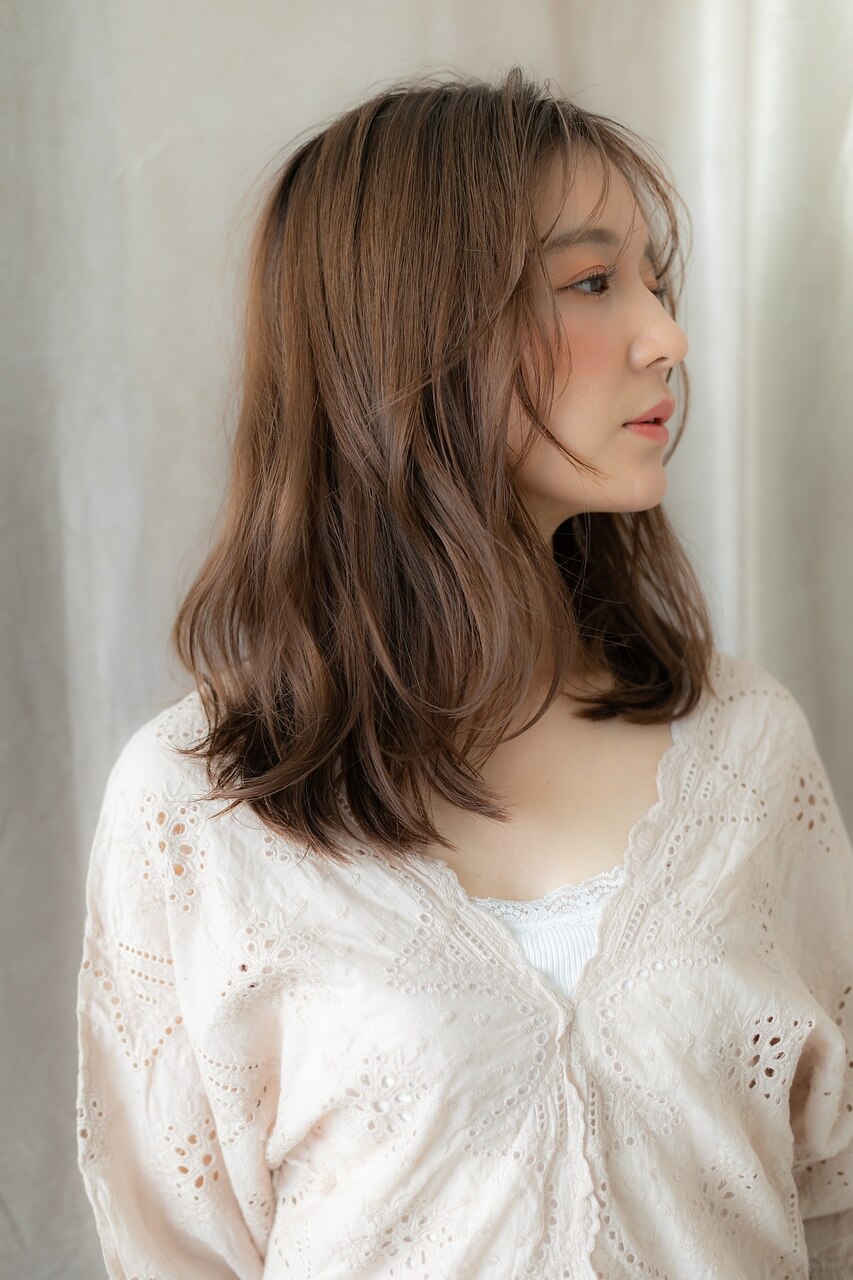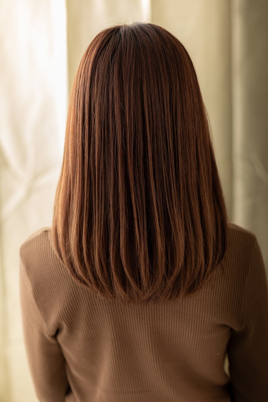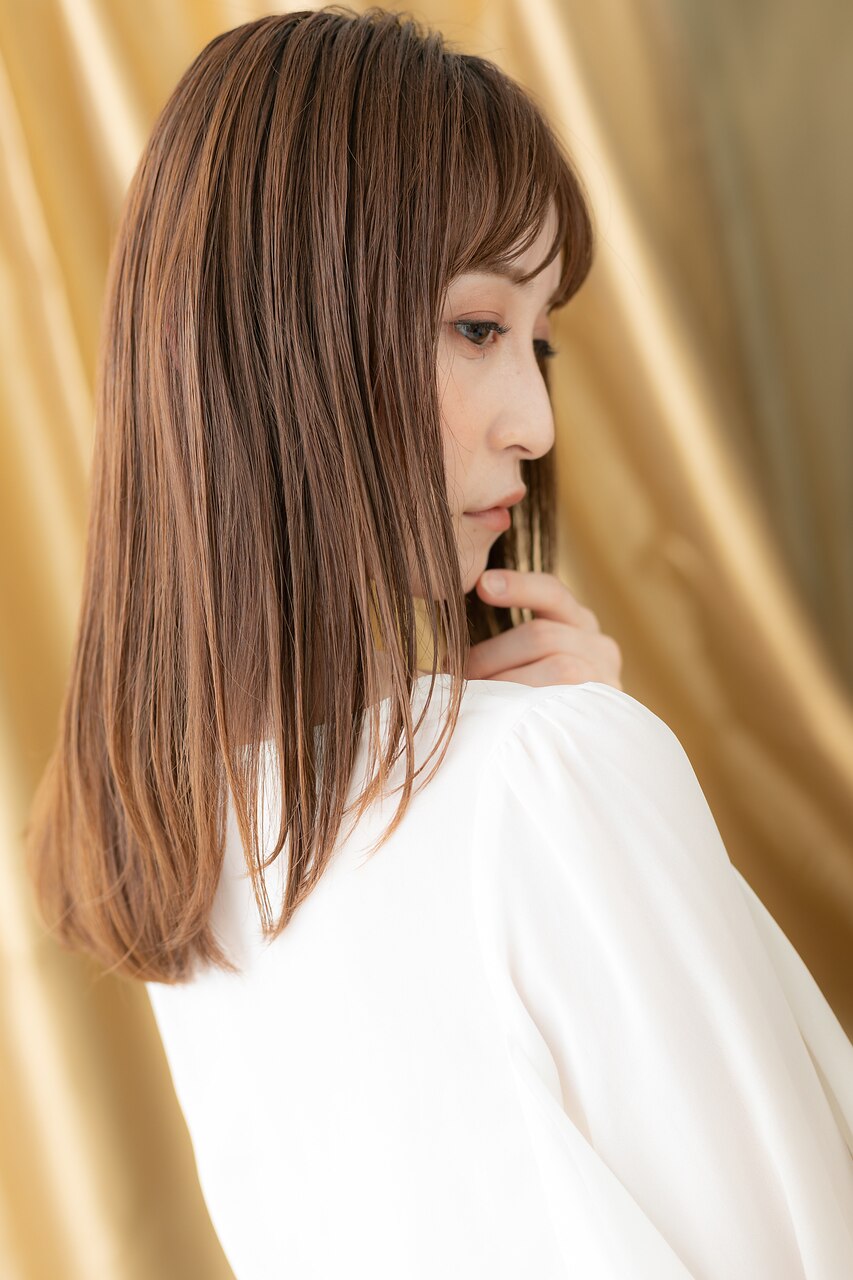 シースルー前髪,鎖骨ミディアム,オン眉,フレンチガーリー,ボブウルフ,ミニボブ,厚めバング,無造作,重めスタイル,くびれショート,切りっぱなしボブ,モード,クラシカル,セミディ,重めスタイル,髪型,ヒアルロン酸ブラウンカラーは白髪にも対応