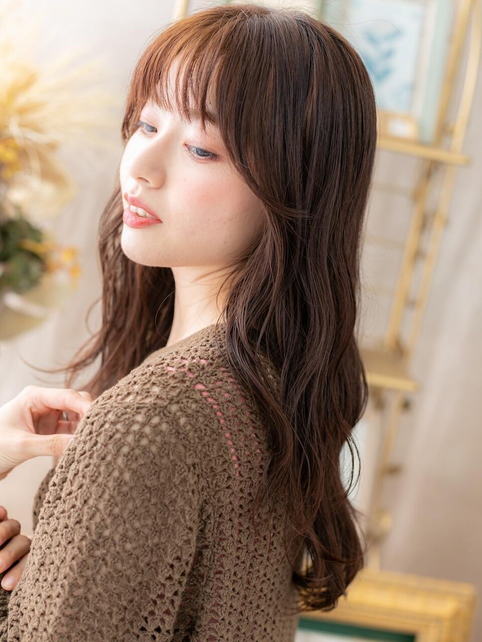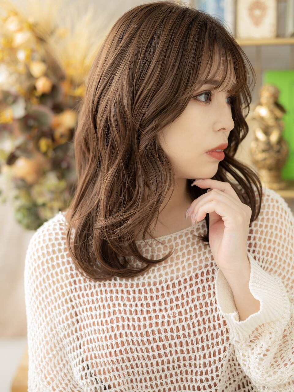 日本人特有の赤味を消し、思わず触りたくなるような質感のヘアカラーに。アディクシーカラーで叶います。シースルーバングや斜めバングでフェミニンにしたり、厚めバングも大人かわいい。