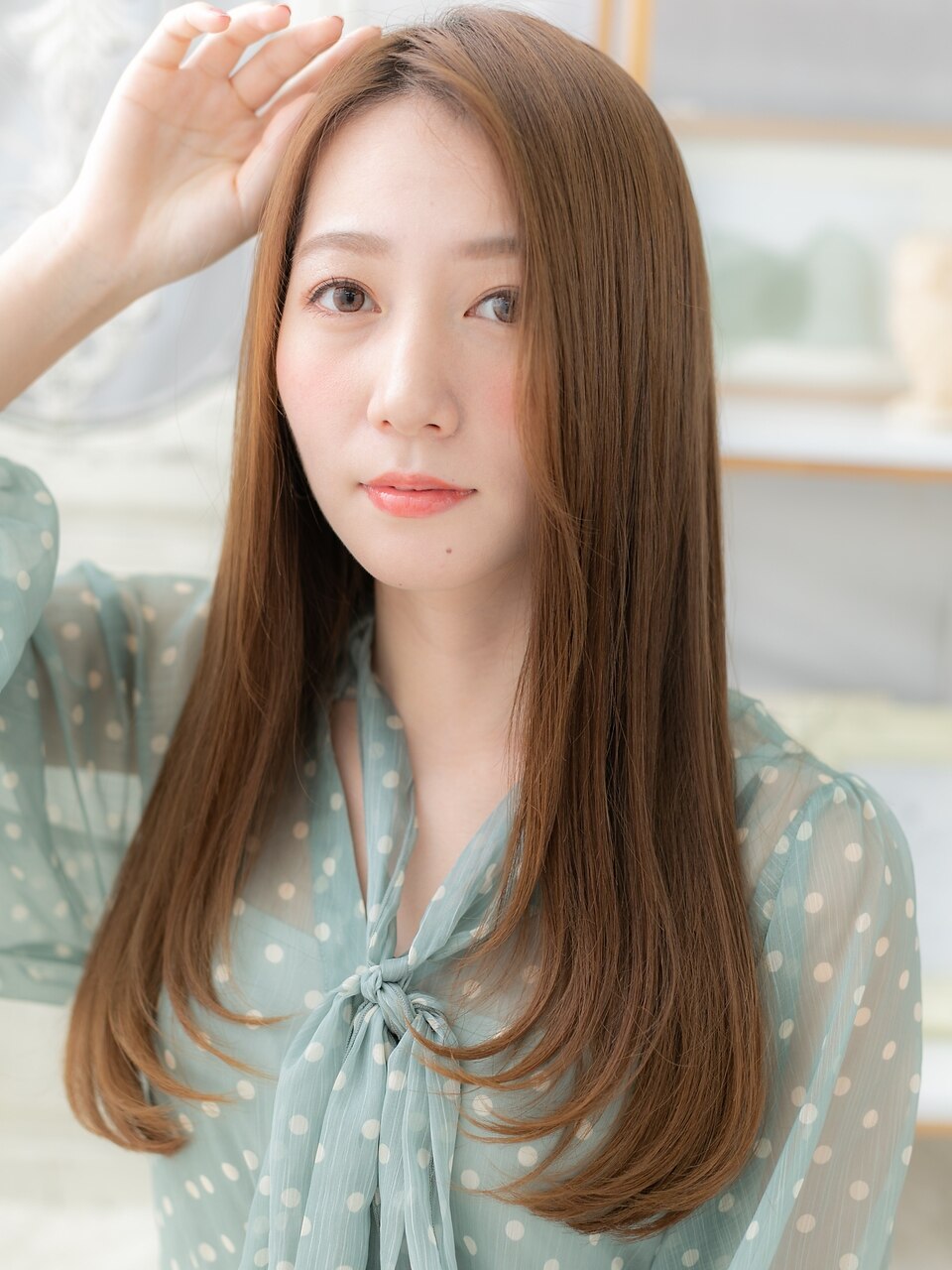 重めスタイルになりがちなストレートロングは、ツヤ感ブラウンベージュカラーで透明感UP。アシンメトリーに仕上げたかきあげバングでこなれ感を出して。斜めバングや厚めバングで目力強調も◎