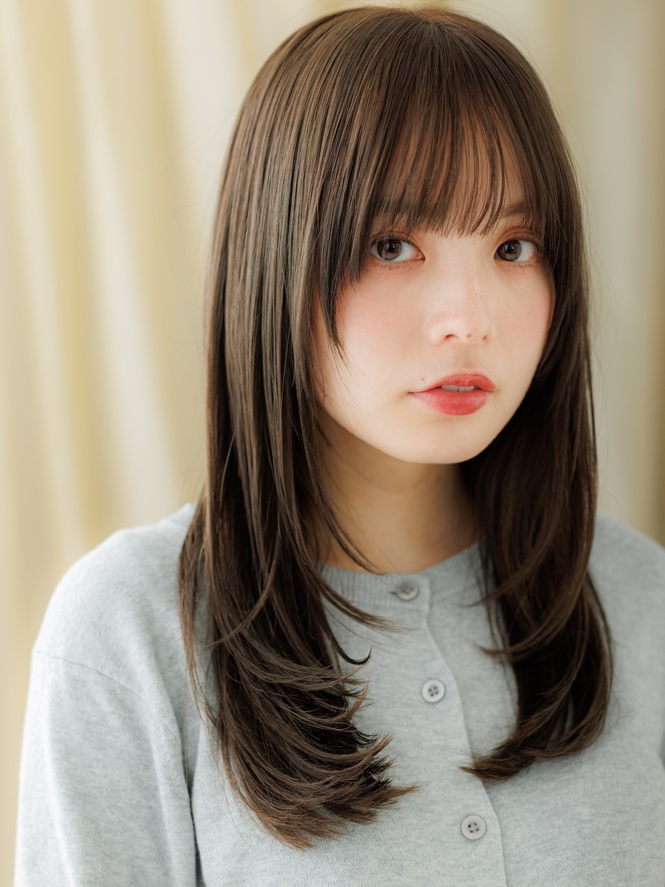 くびレイヤー,レイヤーロング,艶感ストレート,ミディアム,ブリーチなし,オンブレ,ダブルカラー,ブリーチなし,ハイトーンカラー,ミルクティーベージュ,斜めバング,ミストバング,大人可愛い,透明感,ひし形,10代,20代,30代