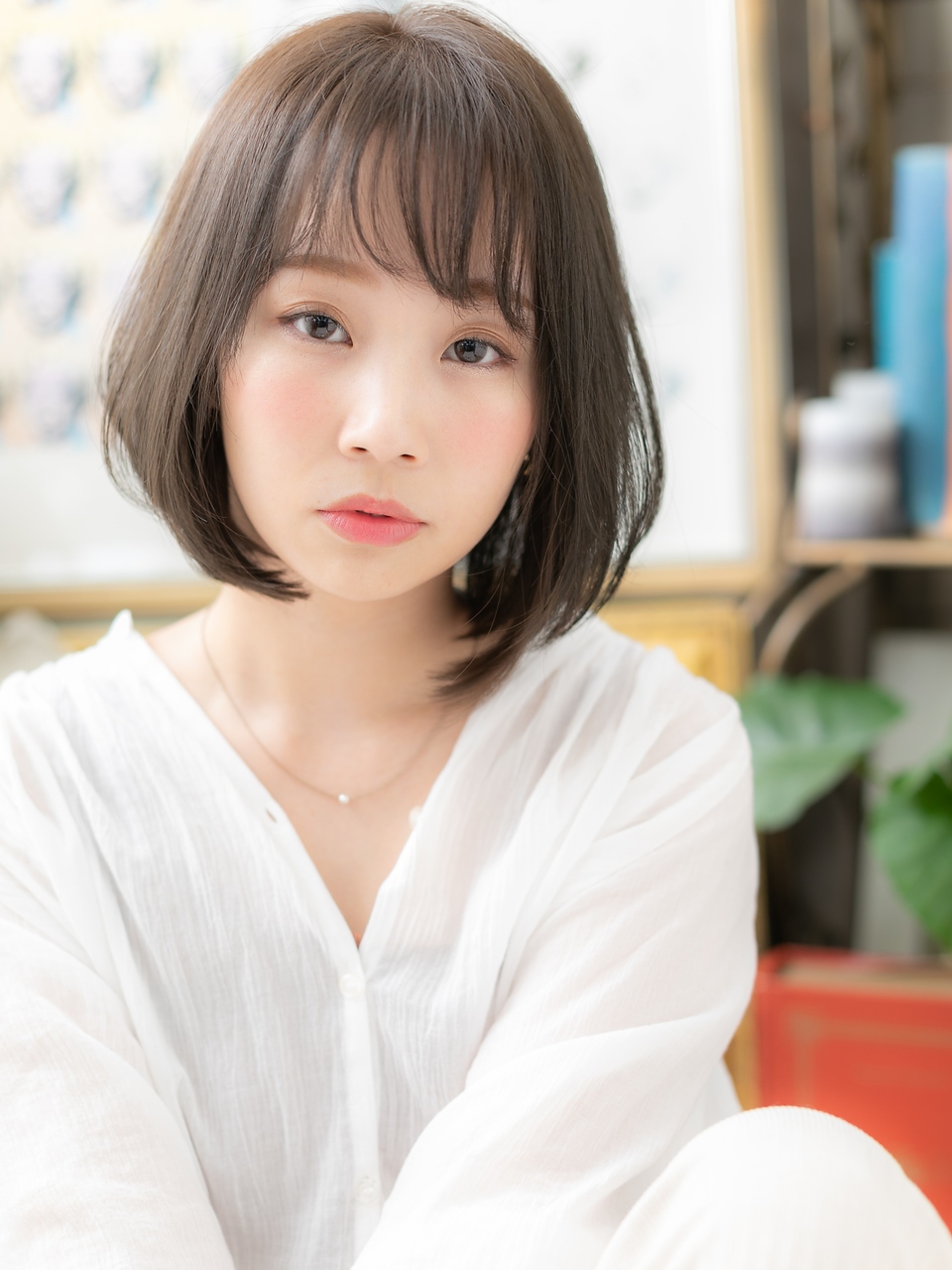 小顔補正カット/シースルーバング/丸みショート/切りっぱなし/ウルフ/艶感ストレート/似合わせカラー/黒髪/くすみカラー/ワンカール/立体感/姫カット/前下がりショート/ひし形レイヤーカット/ミディアム/20代/30代/40代